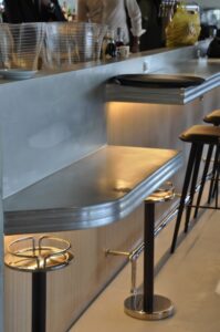 Dans ce brelan de matériau, surgit enfin l’étain, avec l’interminable bar rétroéclairé, dont la piste impeccablement brossée mat réalise le fameux « zinc », comptoir des brasseries authentiques.